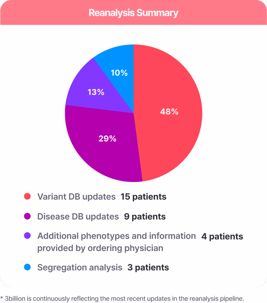 3billion’s reanalysis system integrates updated variant and disease databases, along with internal interpretation models.
