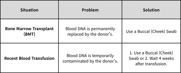 Therefore, a Germline test for a BMT patient must be done using a buccal (cheek) swab.