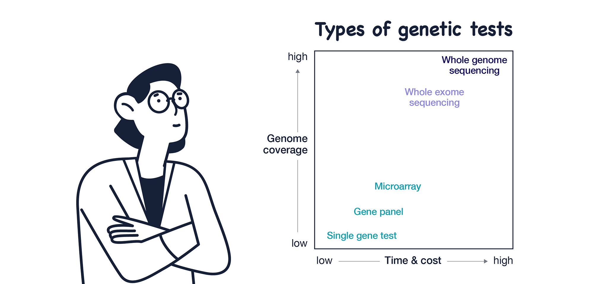 There are two main types of genetic tests: standard tests are faster and cheaper but test only a small number of genes and variants. ES/GS is slower and more expensive but tests almost all variants in the exome/genome.