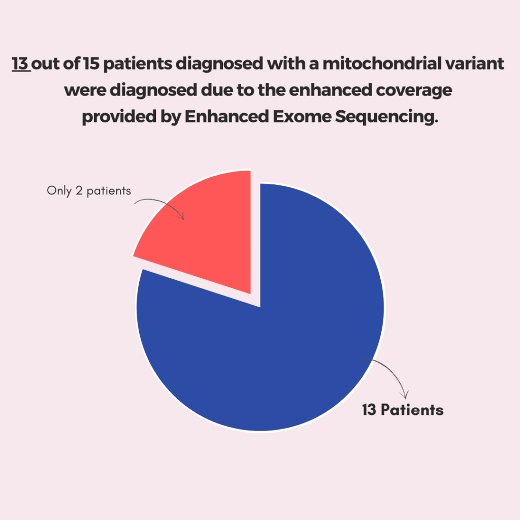 - 13 out of 15 patients diagnosed with a mitochondrial variant were found to have heteroplasmic variants, demonstrating the efficacy of the augmented mitochondrial genome coverage.