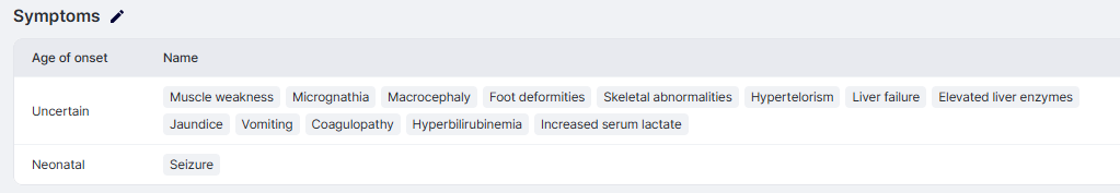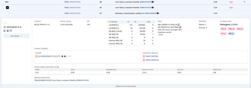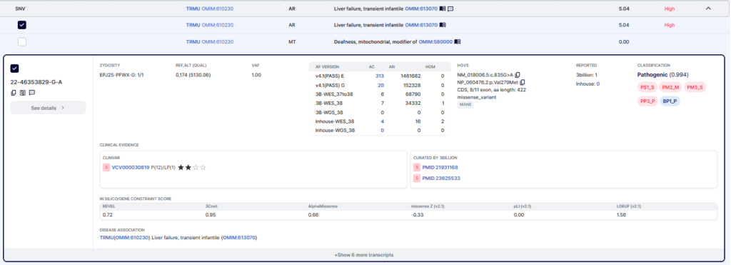 When the TRMU variant is selected, the color tags help visualize how the patient’s symptoms correspond to the known phenotype of this disease.