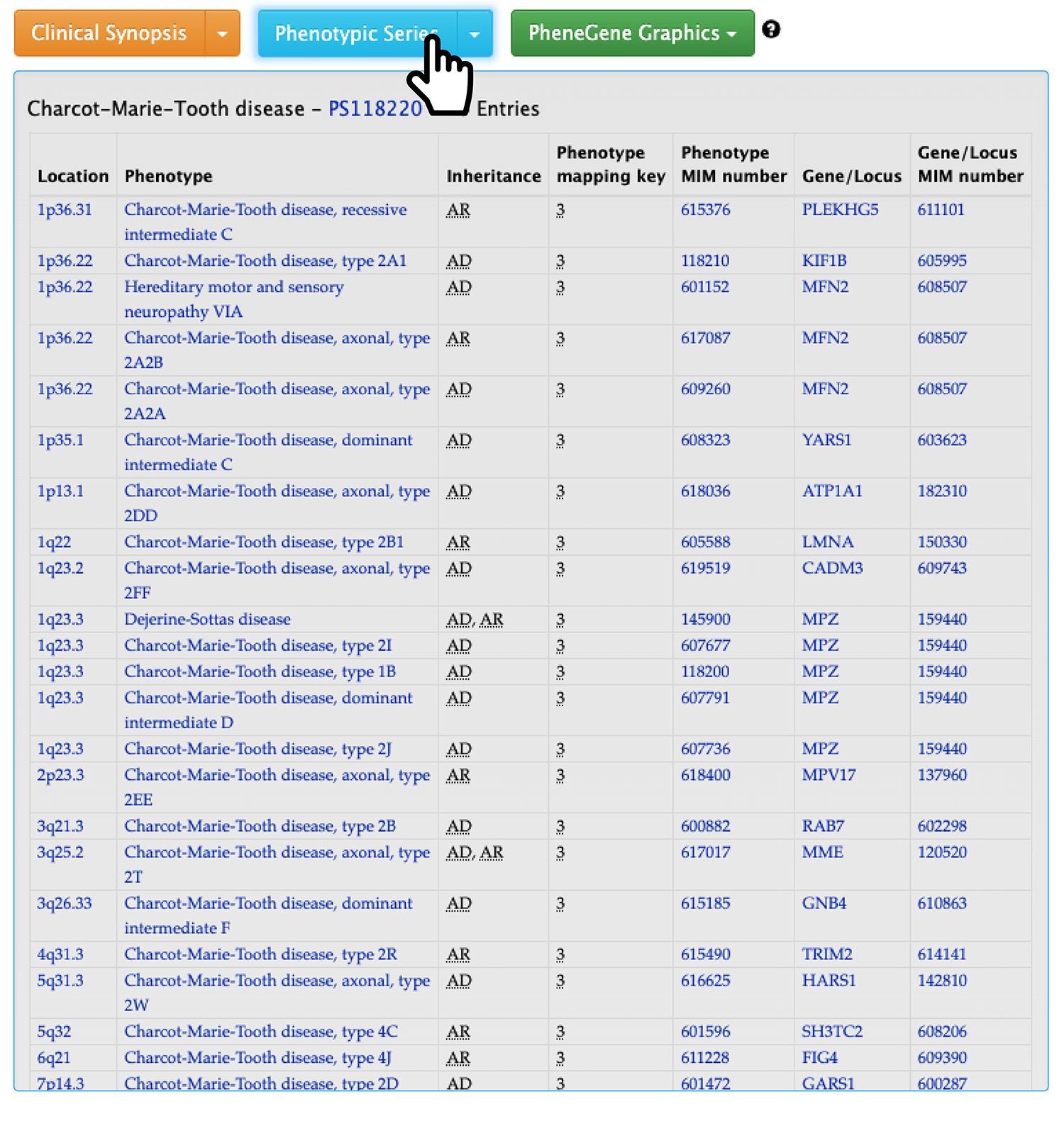 Second, if you expand the ‘Phenotypic Series’ section, you will see a table like the following.