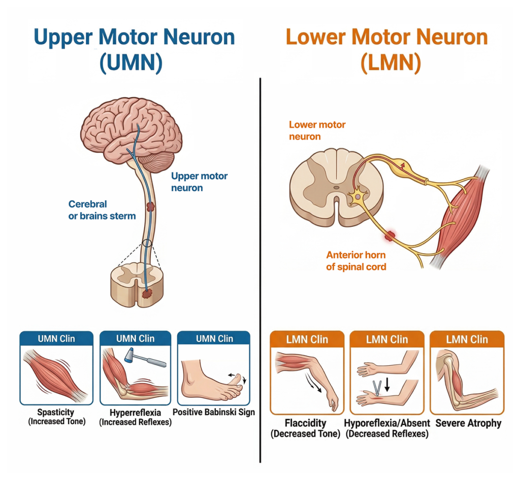 👉 Upper Motor Neuron (UMN) + Lower Motor Neuron (LMN) are both affected simultaneously