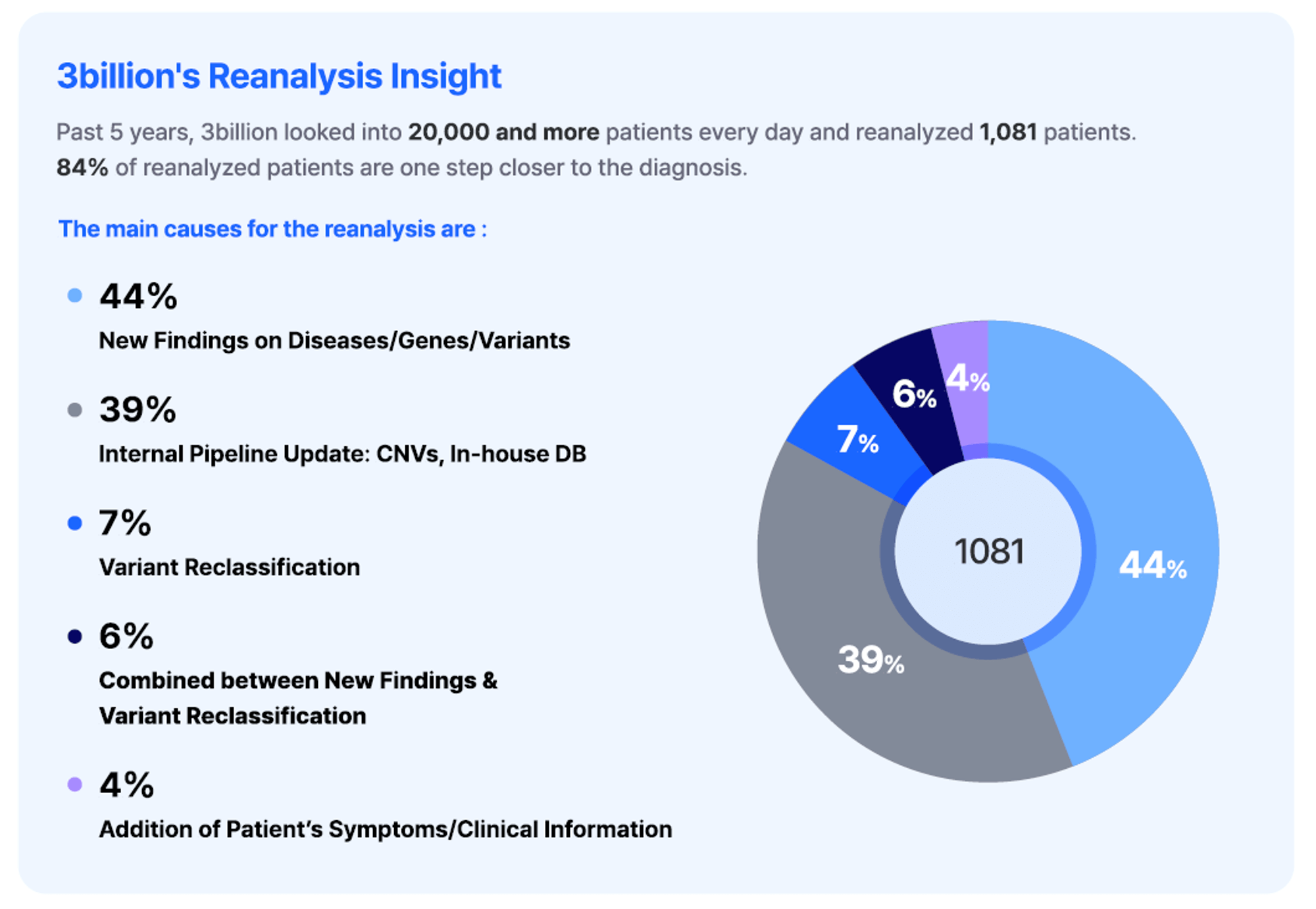 Many companies providing diagnostic genetic testing offer reanalysis services “upon customer request.” But how important is this reanalysis? Let’s explore the significance of reanalysis in diagnostic genetic testing through the five-year reanalysis results conducted by 3billion.