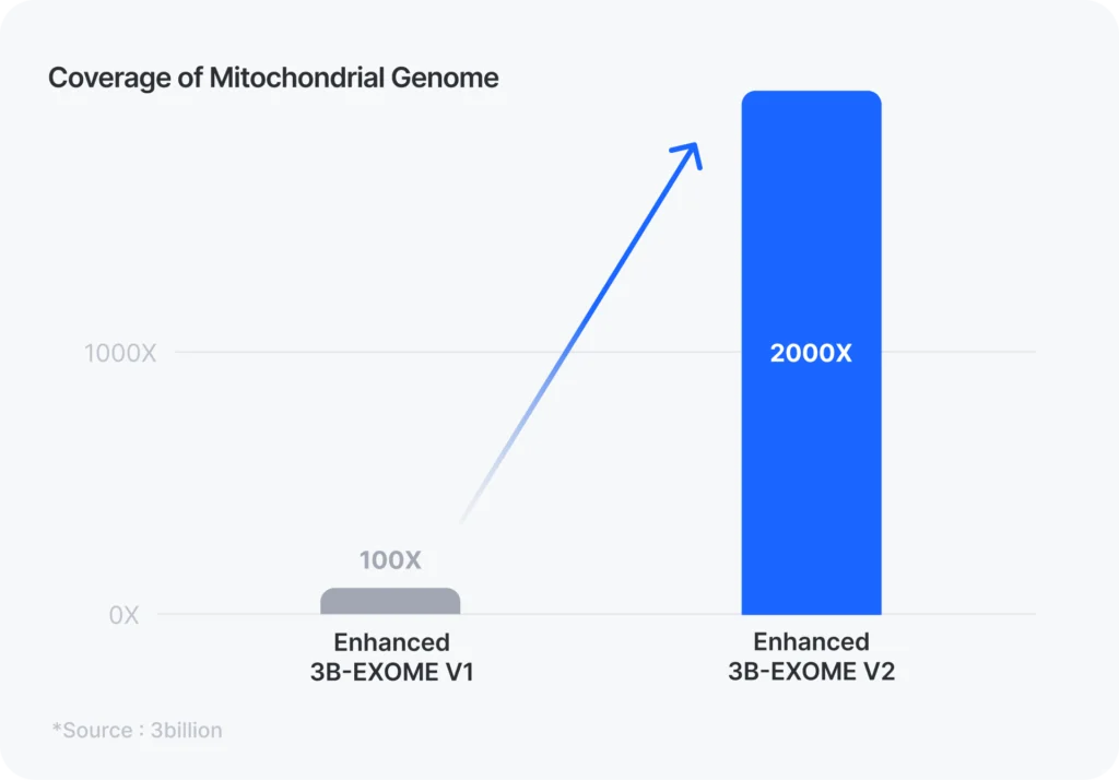 With 3B-EXOME V2, average mitochondrial genome coverage reaches 2000x,