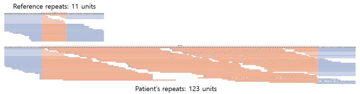 There are some limitations for diagnosis of repeat expansion disorders. Since the number of repeats is estimated using expansion hunter, the exact number of repeats can’t be measured. Also it is impossible to estimate the number of repeats that are too long. For example, patients with congenital myotonic dystrophy 1 are reported to carry more than 1,000 CTG repeats. In this case, the estimated number of repeats were only 123, which is far below a thousand. These are the technical limitations that we are facing. For the cases of repeat expansion disorders, we recommend using our report as a strong suggestion for taking alternate clinical testing such as PCR fragment analysis or southern blotting.