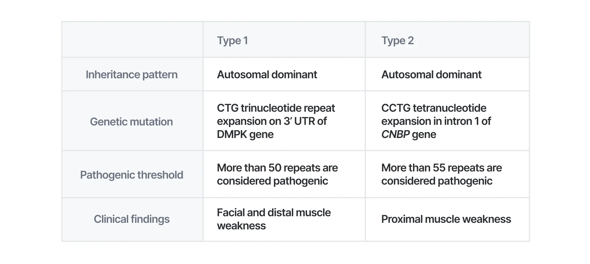 Both types of myotonic dystrophy are caused by repeat expansion in non-coding regions. This means WES can’t diagnose repeat expansion of DMPK and CNBP, since it only targets protein-coding regions.