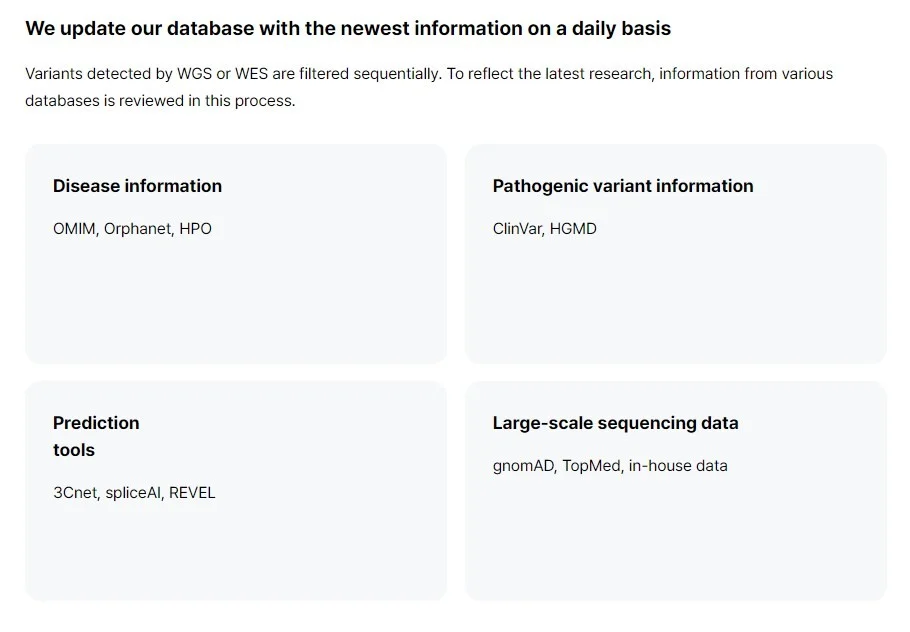 The pathogenicity of over 100,000 variants can be automatically interpreted per minute. (*for WES) Compared with the variant analysis data of ClinVar, the sensitivity of EVIDENCE, 3billion’s automatic variant interpretation system, was 98.4% and the specificity was 99.9%, proving EVIDENCE’s superior variant interpretation performance.