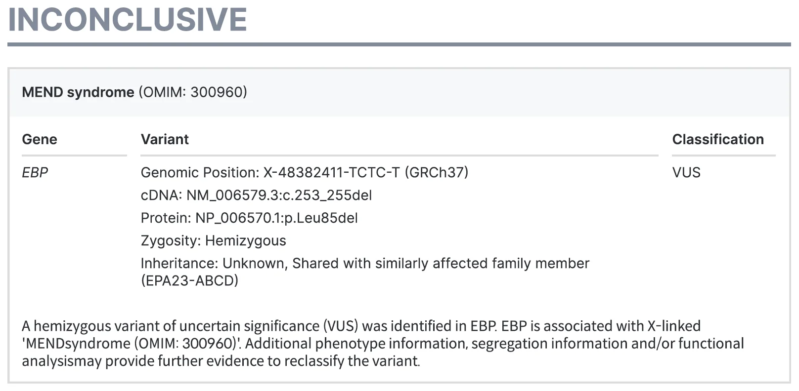 An inconclusive result indicates that the likely cause of the disease has been identified through the test, but the current supporting evidence is insufficient for an accurate diagnosis to be made. Suspicious variants are reported, along with variant classification information and the supplemental information needed to reclassify variants.