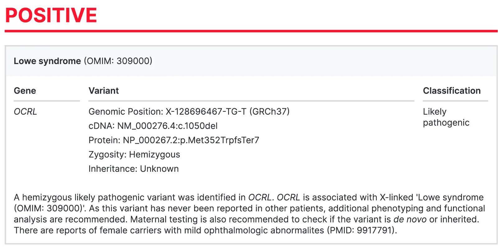 A positive result suggests that the cause of the patient’s disease has been identified through the test. One or more genetic variants that have a 90% or higher likelihood of causing the disease are reported.