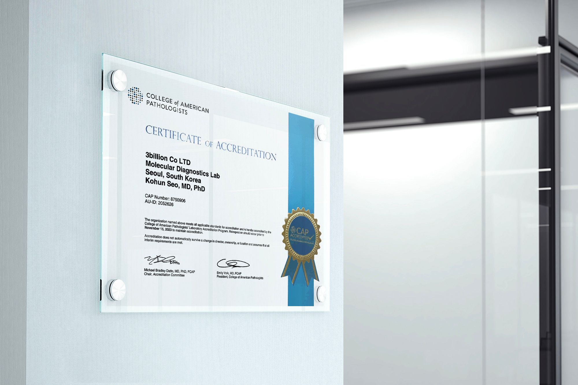 Wherever diagnostic testing is offered, the words CAP-accredited or CLIA-certified naturally come up. Overseas doctors and researchers who are interested in our testing often ask first whether 3billion has obtained any such accreditation. Perhaps this is because CAP accreditation serves as the first criterion to determine whether a laboratory is trustworthy.