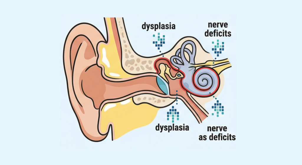 A cohort study conducted at Cincinnati Children’s Hospital (n=57) examined the relationship between CHD7 variant type and the nature of hearing loss in pediatric patients. Hearing loss was identified in 97% of the cohort, and 83% demonstrated severe-to-profound loss in at least one ear — figures exceeding those reported in prior literature. A statistically significant association was observed between variant type and hearing loss classification (p=0.002), with haploinsufficiency resulting from nonsense or frameshift variants conferring the greatest risk for sensorineural hearing loss (SNHL). The authors also emphasized the importance of systematic evaluation, including temporal bone CT, for accurate prevalence estimates. ¹