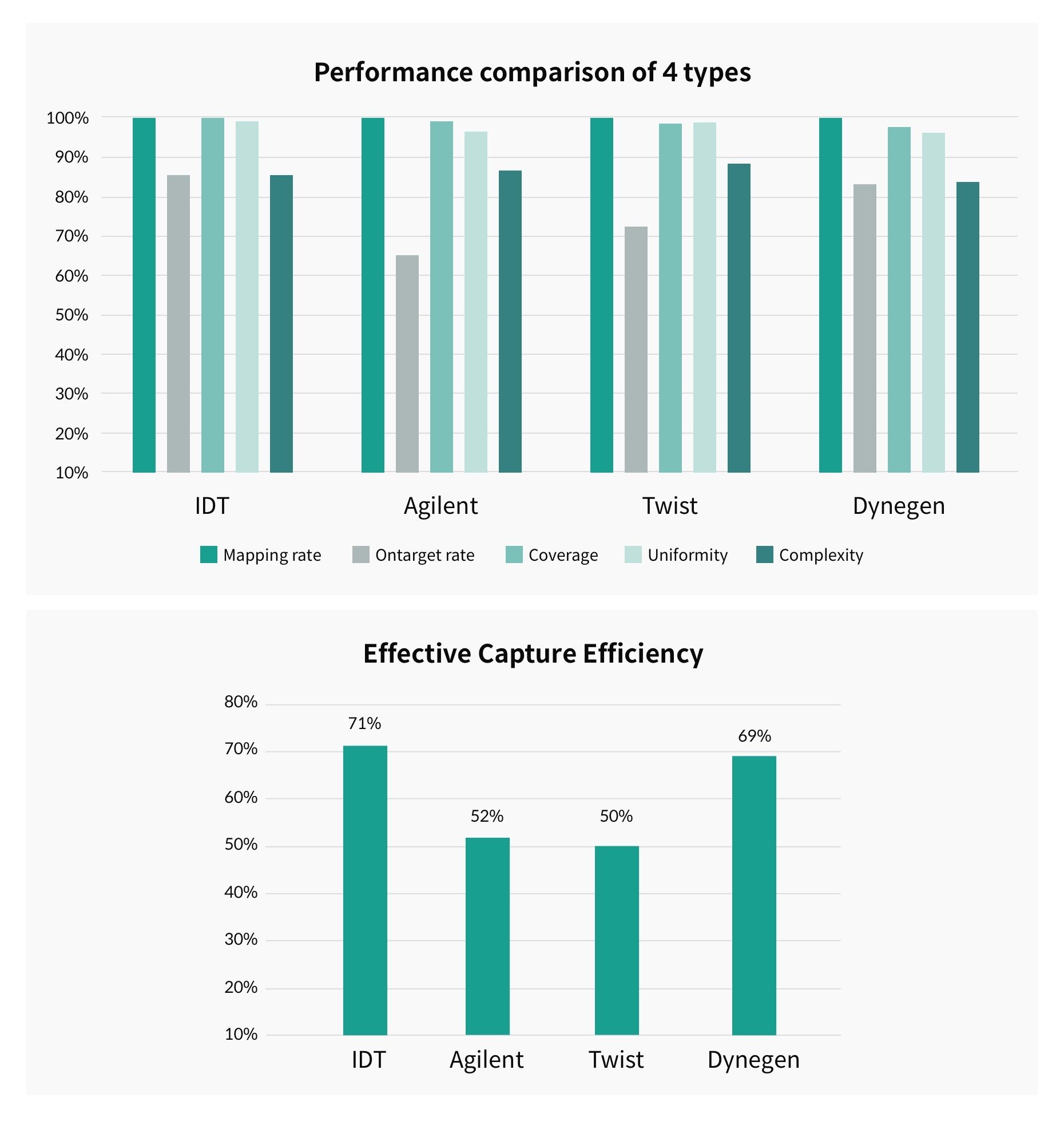 Figure 2 shows the results of a study1 comparing capture efficiency according to 5 criteria for each kit type. Upon comparing a total of 4 types of kits, IDT and Dynegen kits showed the highest efficiency. According to the study results, the IDT kit has the advantage of evenly covering the entire exome region with its high coverage in the GC-rich region where PCR bias frequently occurs.