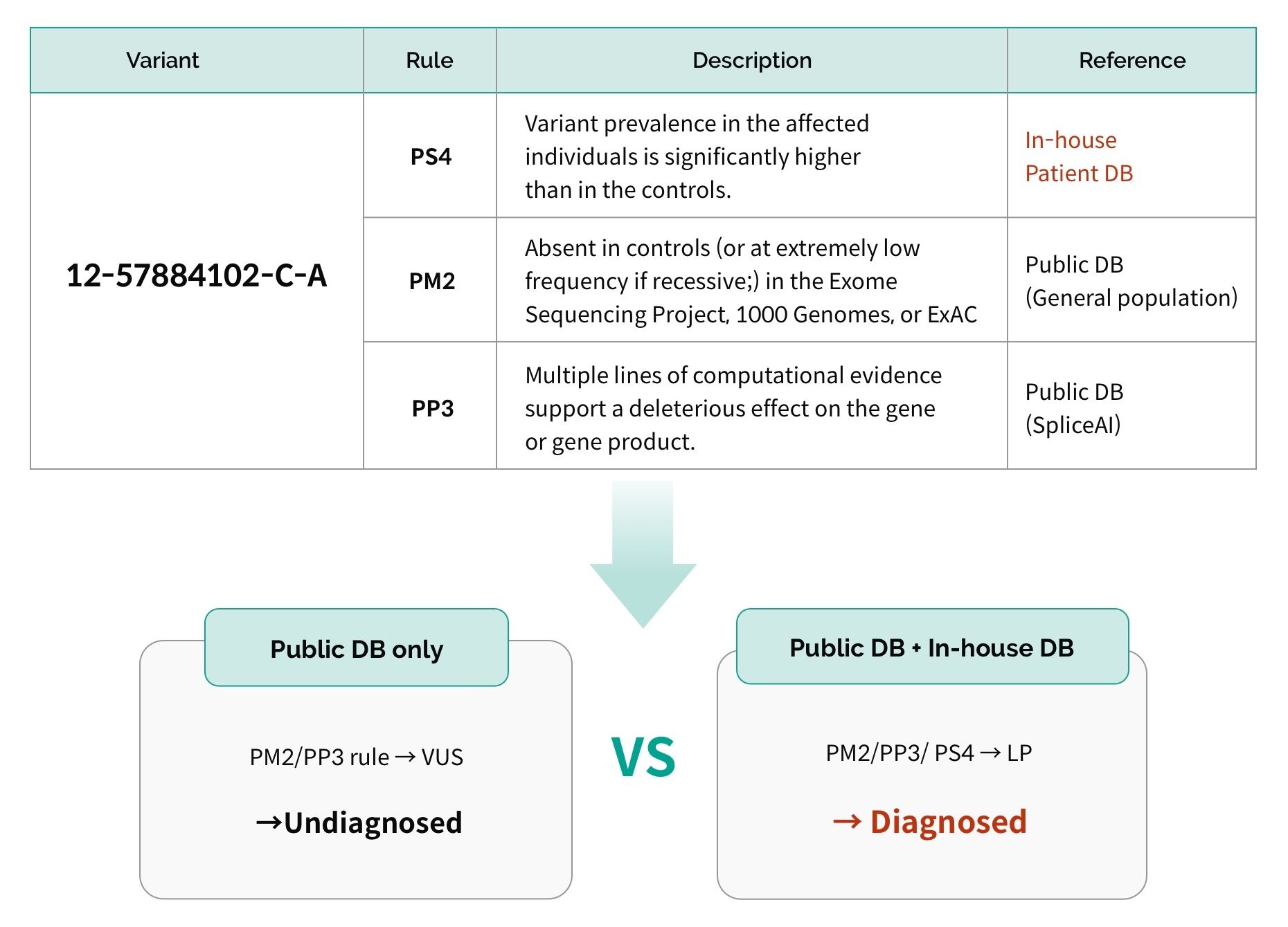 - Difference in databases useWhen rare disease-related variants are found by researchers, they are registered in public databases such as ClinVar and HGMD, which are widely utilized. The more frequently the database is updated, the more recent information it has. Also, aside from publicly available databases, if an entity has its own inhouse database, depending on the database size and content, there may be variants that can only be interpreted by specific entities.