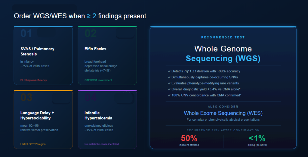 - Standard G-banded karyotyping cannot detect the 7q11.23 deletion; WGS or WES enables simultaneous confirmation of the deletion and identification of co-occurring variants in a single test.