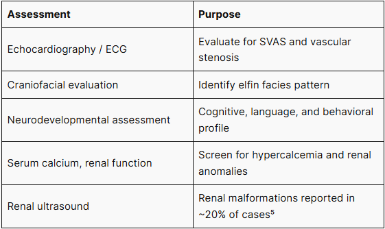 WBS diagnosis is based on a combination of characteristic phenotypic features. Initial clinical workup should include: