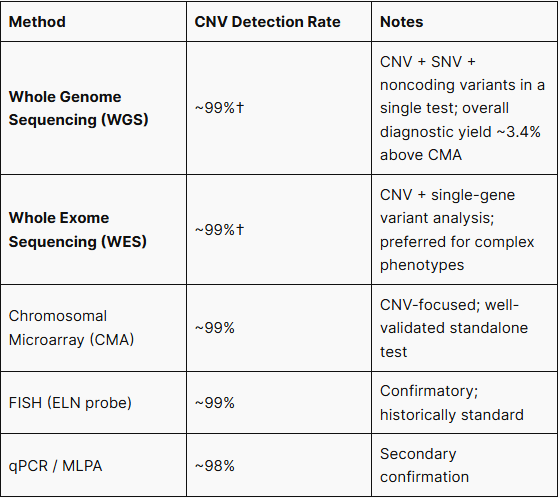 WGS and WES detect the 7q11.23 deletion with accuracy equivalent to CMA, while simultaneously capturing co-occurring SNVs, phenotype-modifying rare variants, and noncoding region changes — all from a single test. In a head-to-head comparison of 532 clinical cases, low-pass WGS achieved an overall diagnostic yield of 23.1% versus 22.4% for CMA, a relative improvement of approximately 3.4%.⁶ A separate validation study confirmed 100% concordance between LP-WGS and CMA across 55 CNVs ranging from 75 kb to 90.3 Mb.⁷ For patients with atypical presentations, CMA-negative results despite strong clinical suspicion, or where concurrent evaluation of comorbid genetic conditions is warranted, WGS or WES is the preferred comprehensive diagnostic approach.⁸