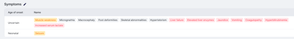 When the TRMU variant is selected, the color tags help visualize how the patient’s symptoms correspond to the known phenotype of this disease.