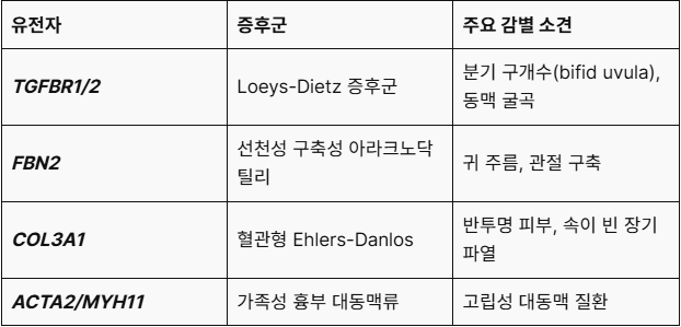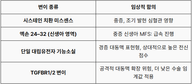 • 마르판 증후군의 약 90%는 FBN1 병원성 변이에 의해 발생하며, TGFBR1/2FBN2 변이는 유사한 표현형을 나타낼 수 있습니다.