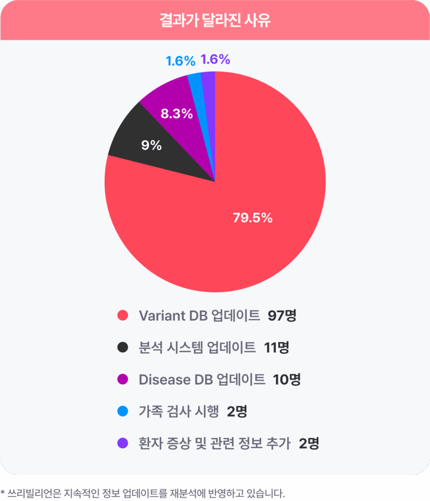 즉, 시간이 흐르면서 진단 해석의 근거가 바뀐 것이 가장 큰 영향을 주었고(변이 데이터베이스 업데이트와 질병 데이터베이스 업데이트를 합쳐, 총 87.8%나 되어요!), 그 결과, 기존의 보고서가 Positive/Inconclusive 보고서로 바뀔 수 있었던 것이죠.