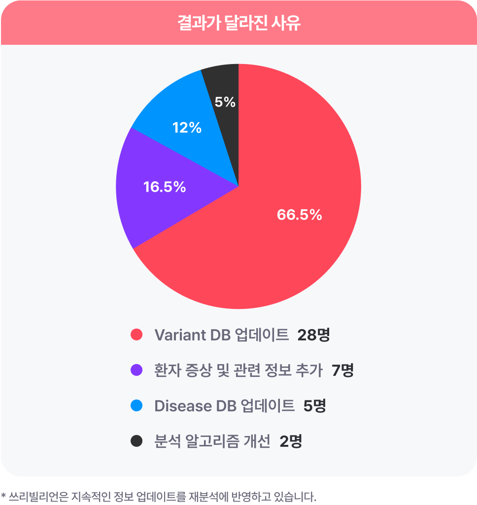 즉, 시간이 흐르면서 진단 해석의 근거가 바뀐 것이 가장 큰 영향을 주었고(변이 데이터베이스 업데이트와 질병 데이터베이스 업데이트를 합쳐, 총 78.5%로 집계되었어요), 그 결과, 기존의 보고서가 Positive/Inconclusive 보고서로 바뀔 수 있었던 것이죠.