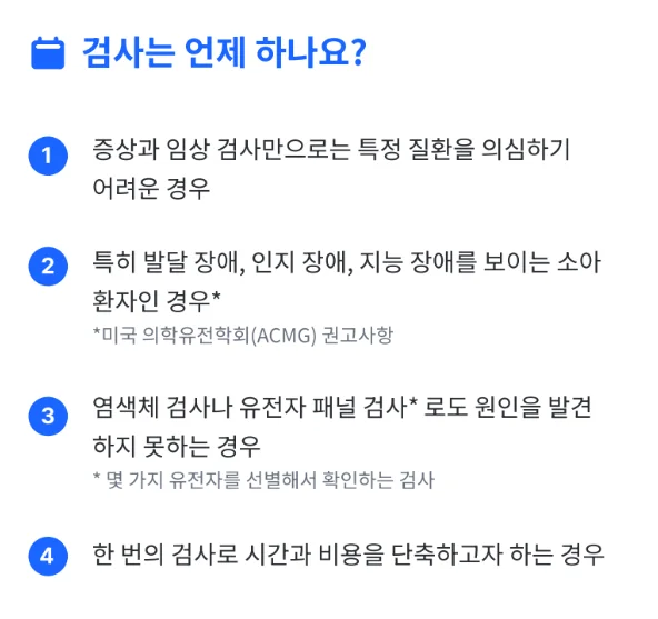 이 글을 통해 병원에서 아이 유전자 검사를 하게 되는 경우와 검사 비용, 기간 등에 대한 궁금증이 풀리셨기를 바랍니다. 궁금한 점이 있으시다면 언제든 FAQ를 통해 편히 문의 주세요.
