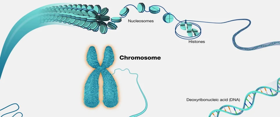 하나의 염색체 안에 수백에서 수천 개의 유전자가 들어 있습니다. 즉, 염색체가 유전자보다 큰 단위의 개념이에요.