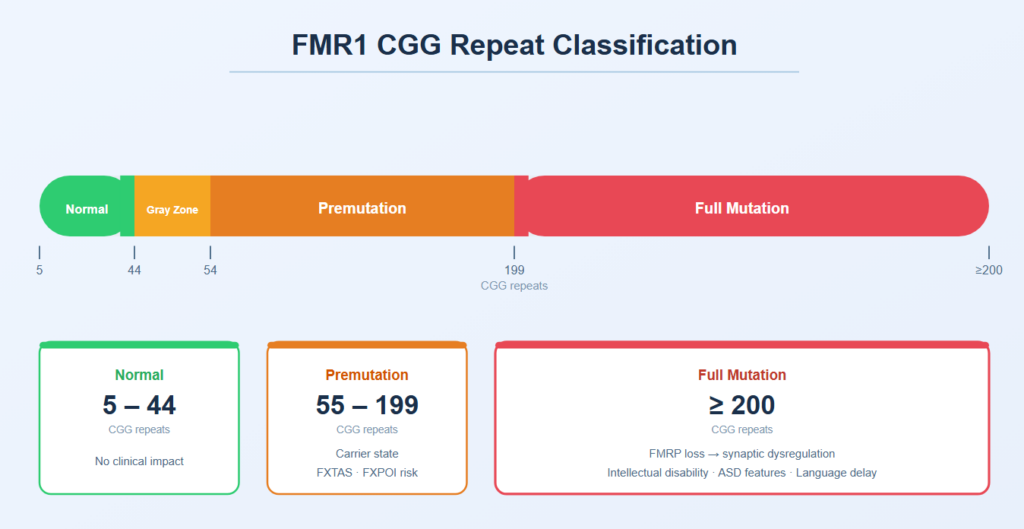 2. FMR1 유전자의 CGG 반복 수에 따라 Full Mutation(≥200회)과 Premutation(55~199회)으로 구분되며, 두 군의 임상 양상과 유전 리스크는 크게 다릅니다.