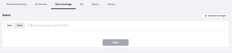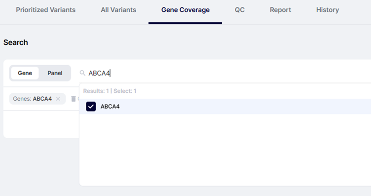 예를 들어 ABCA4 유전자를 검색하면, 이 유전자의 10× 및 20× 커버리지가 퍼센트로 표시되어 시퀀싱이 충분히 이루어졌는지 즉시 알 수 있습니다.