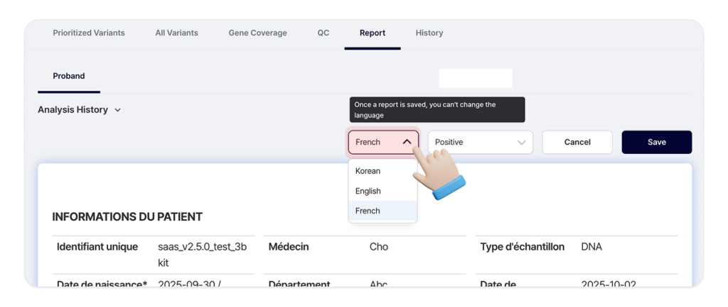 - 방법: 리포트 생성 화면 내 Language 항목 클릭 > French 선택