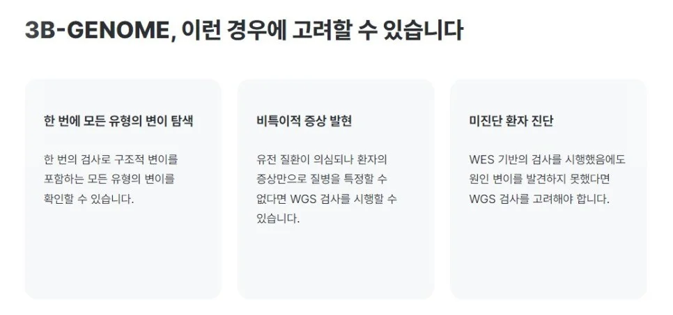 엑솜 검사와 지놈 검사에서는 예상했던 유전자 이외에 다른 유전자에서 예기치 못하게 돌연변이를 발견할 수 있습니다. 그렇기에 환자가 가진 증상만으로 진단하기 어렵거나 원인 유전자가 다양하여 일반적인 패널 검사로 검사가 충분하지 못할 때 유용하게 사용됩니다.