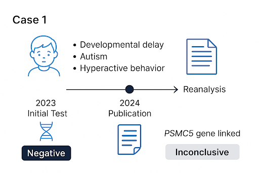 - 배경: 2023년, 한 환자는 발달지연, 자폐, 과잉행동 등의 증상을 겪고 있었습니다. 당시 첫 유전체 분석에서는 PSMC5 유전자와 질환의 연관성이 보고되지 않아 ‘Negative’ 결과를 받았습니다.