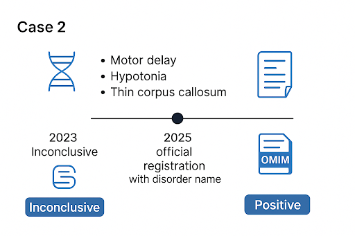 - 배경: 운동발달 지연, 근긴장저하, 뇌량 저형성 등 다양한 증상을 보이던 또 다른 환자입니다. 2023년 초기 분석 당시 EEF1D 유전자에 대한 문헌 보고는 있었으나, OMIM(온라인 멘델 유전 질환)에는 정식 질환으로 등재되지 않아 ‘Inconclusive’ 판정을 받았습니다.