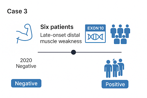 - 배경: 2020년, 늦게 발병한 원위부 근력약화 증상을 보이던 여러 환자들의 샘플이 CNV(유전자 복제수 변이) 분석 없이 ‘Negative’로 남아있었습니다.