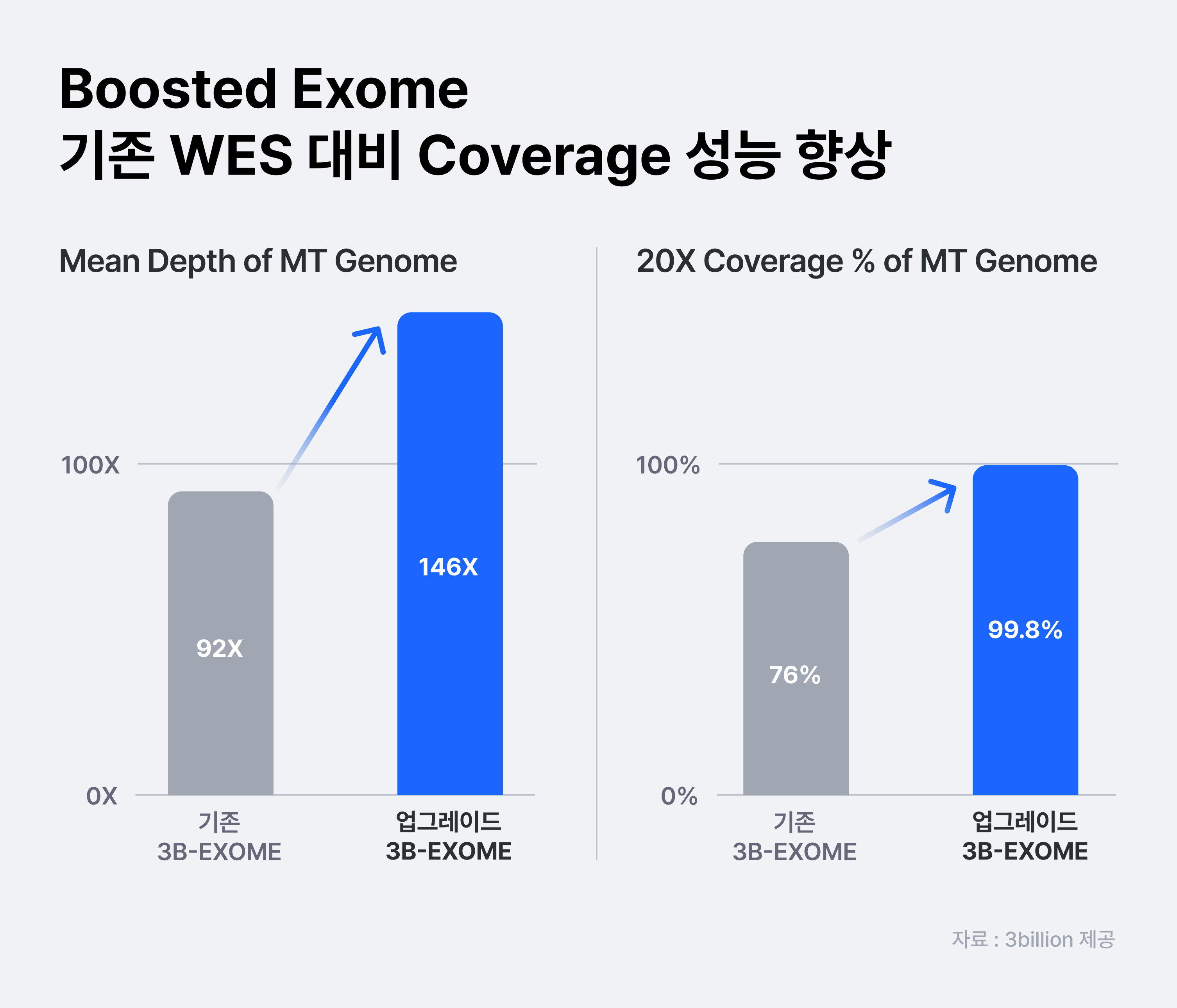 Boosted Exome은 기존의 WES(전장엑솜시퀀싱)이 커버하지 못하던 변이를 검사할 수 있도록 쓰리빌리언이 직접 설계한 칩을 사용한다. Boosted exome은 미토콘드리아 유전체 커버율을 기존 76%에서 99.8%까지 높이고, 엑솜 영역 외에 존재하는 주요 병원성 변이 영역을 추가하여 진단 효율을 높인 제품이다.