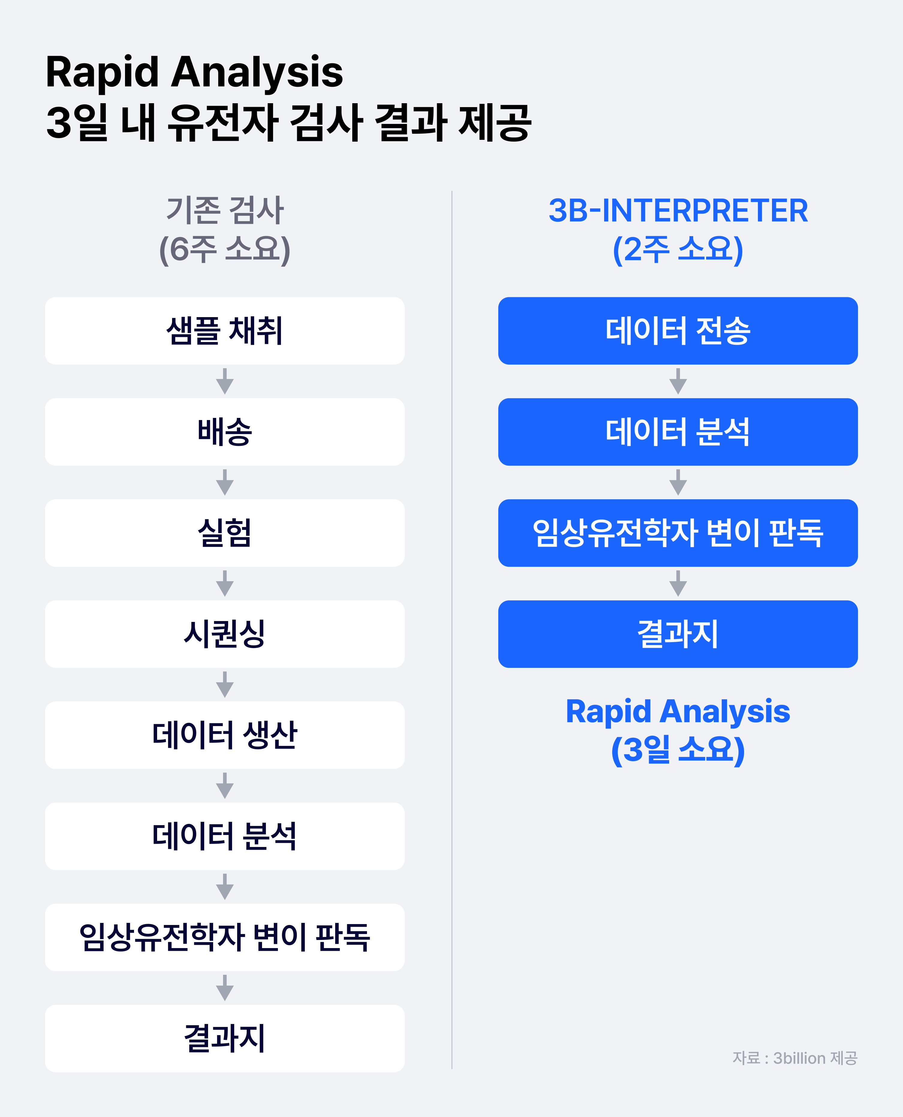 3B-INTERPRETER와 Rapid analysis는 환자의 유전체 데이터를 쓰리빌리언의 AI 유전변이 해석 시스템을 활용해 진단 할 수 있도록 한 서비스이다. 기존에 유전체 검사를 받고 진단에 실패한 환자들이 데이터만으로 검사를 받을 수 있다.