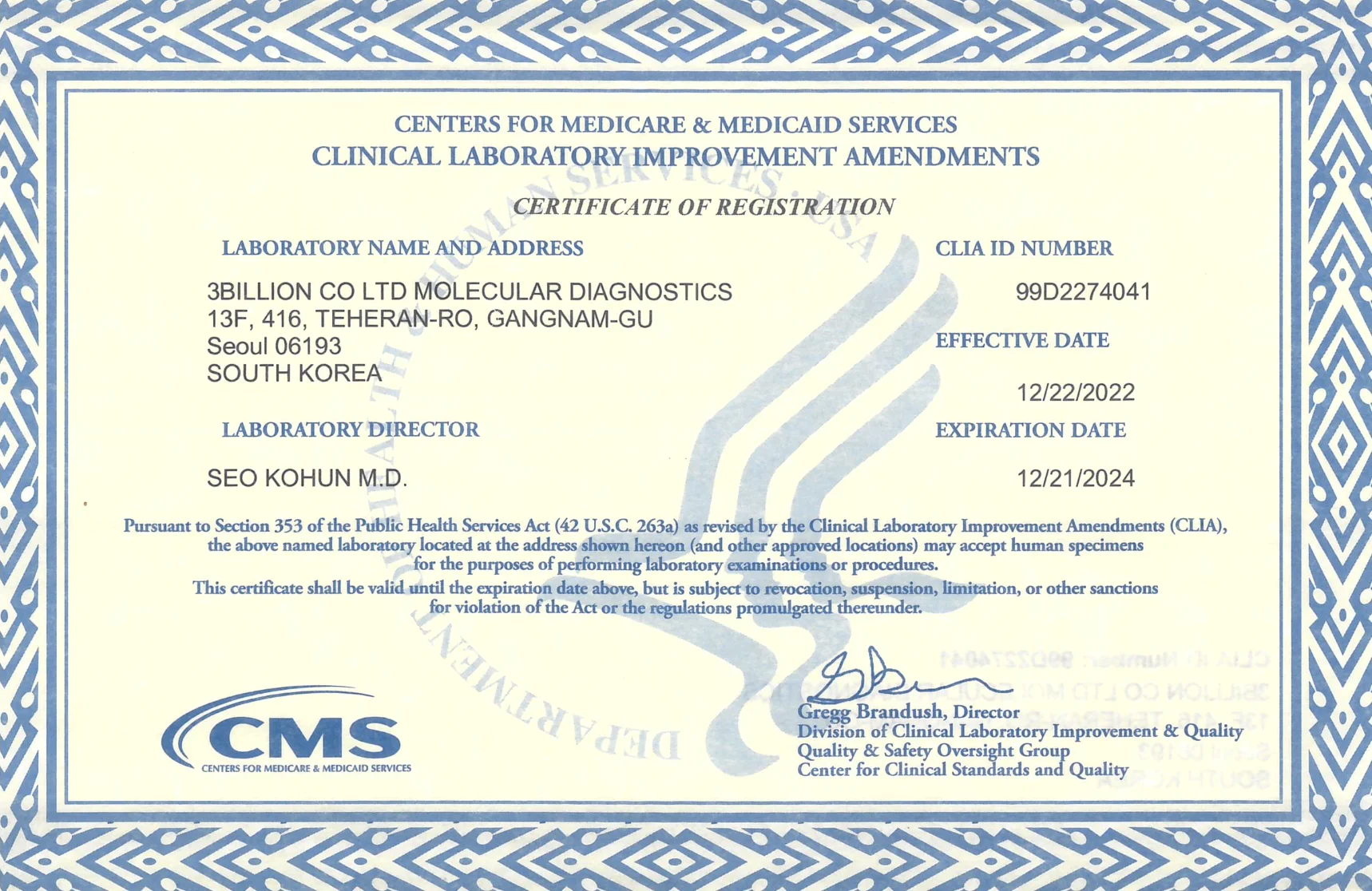 이를 통해 미국 국민을 대상으로 진단 목적의 유전자 검사를 제공할 수 있는 자격을 부여 받았으며, 이는 쓰리빌리언에서 제공하는 진단 검사가 미국 의료보험 수가를 적용받을 수 있다는 것을 의미하기도 합니다.