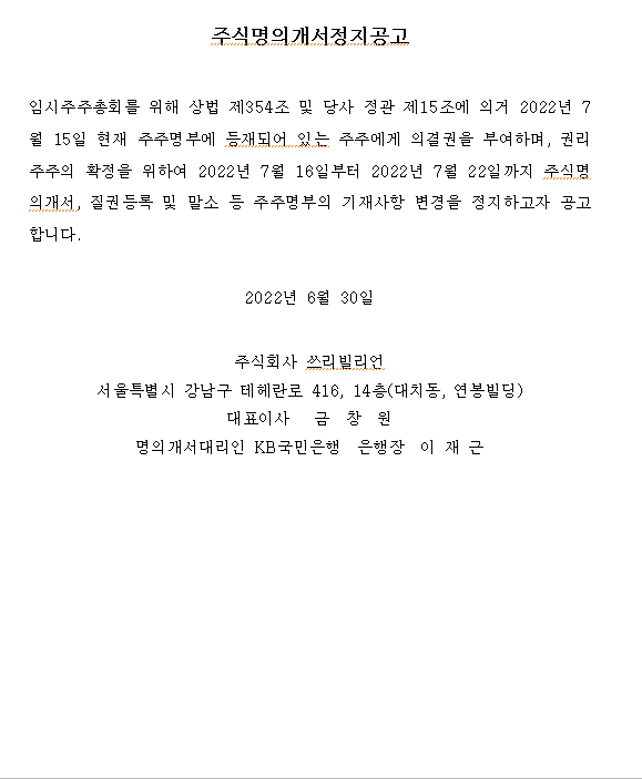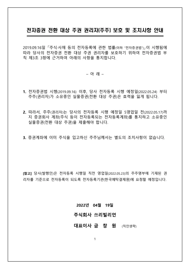 - 전자증권 전환 대상 주권 권리자(주주) 보호 및 조치사항 안내2022.04.19